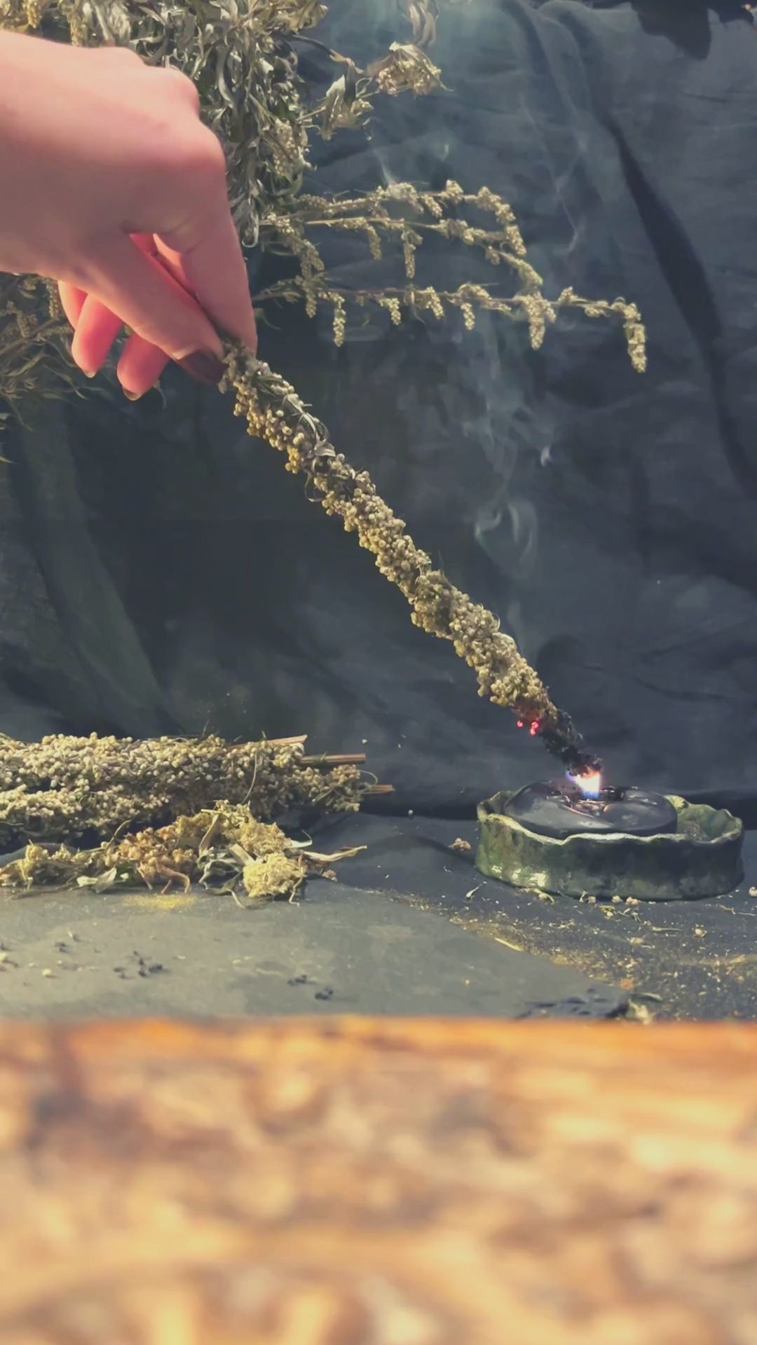 - Wiązanka lub pęczek ziół: Zapal końcówkę pęczka i pozwól jej się rozżarzyć. Zdmuchnij płomień, aby dym unosił się delikatnie.