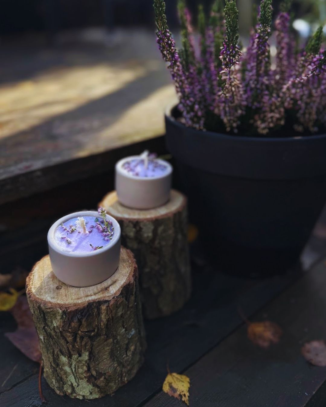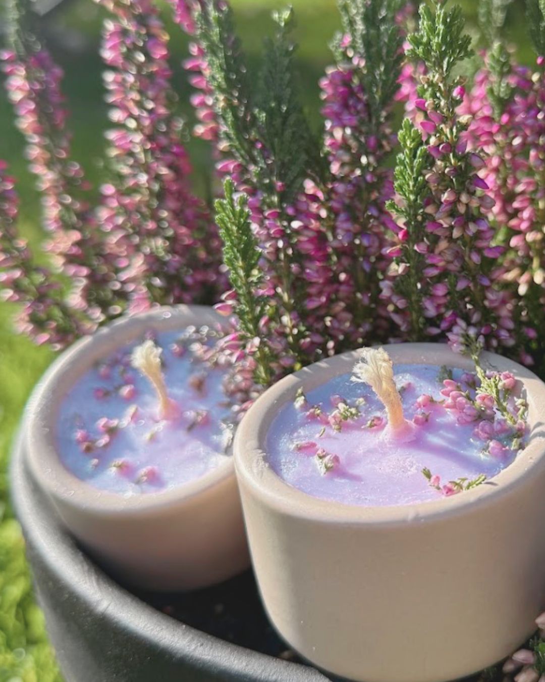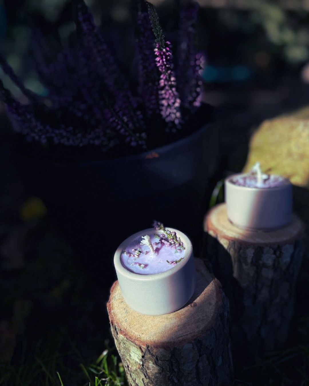 Ciało tej świecy to ceramiczna czarka, w której zaklęto barwy późnego lata – ciepłe fiolety, szarości i złamane beże. Kwiaty wrzosu, którymi ją ozdobiłam, przypominają o pięknie prostoty i o sile natury, która trwa, nawet gdy świat milknie.