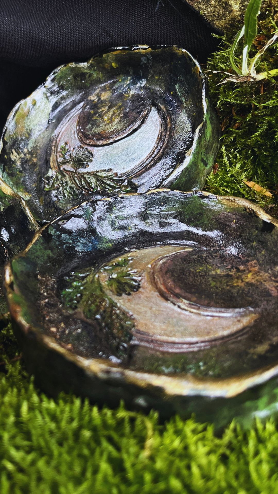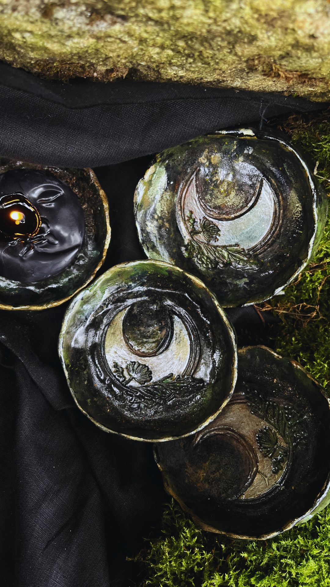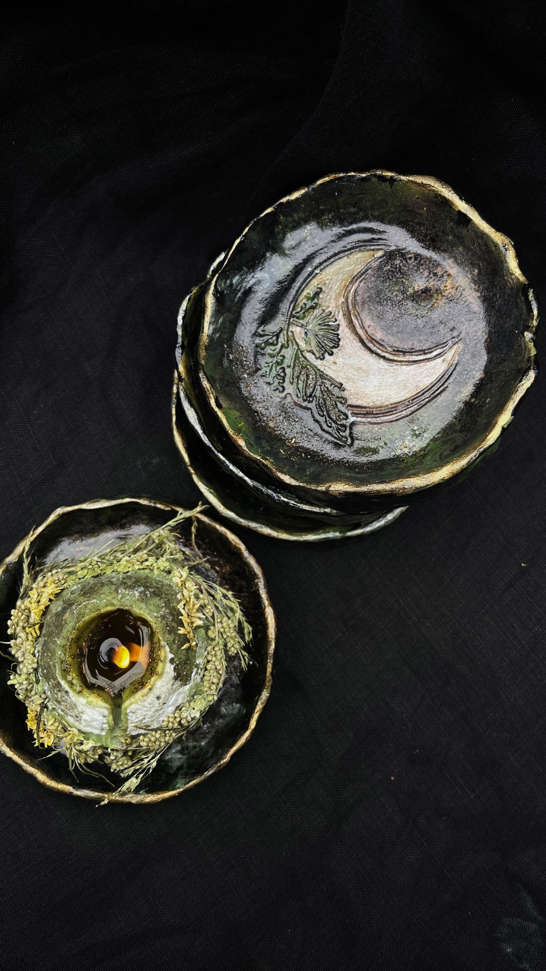Miseczka została stworzona, by służyć jako bezpieczne miejsce do palenia świec, jednocześnie chroniąc powierzchnie przed rozlanym woskiem. Możesz jej również użyć jako ozdobnej podstawki na biżuterię, zioła lub inne drobiazgi. Subtelne zdobienia, nawiązujące do blasku i tajemnic Księżyca, sprawiają, że miseczka idealnie pasuje do wnętrz inspirowanych naturą i rękodziełem. Kolorystykę tej miseczki dobrałam myślą o głębokim, mszysto zielonym odcieniu, inspirowanym soczystym leśnym runem. Ten kolor symbolizuje połączenie z naturą i przynosi na myśl gęste, tajemnicze lasy, gdzie Księżyc delikatnie oświetla ścieżki.
