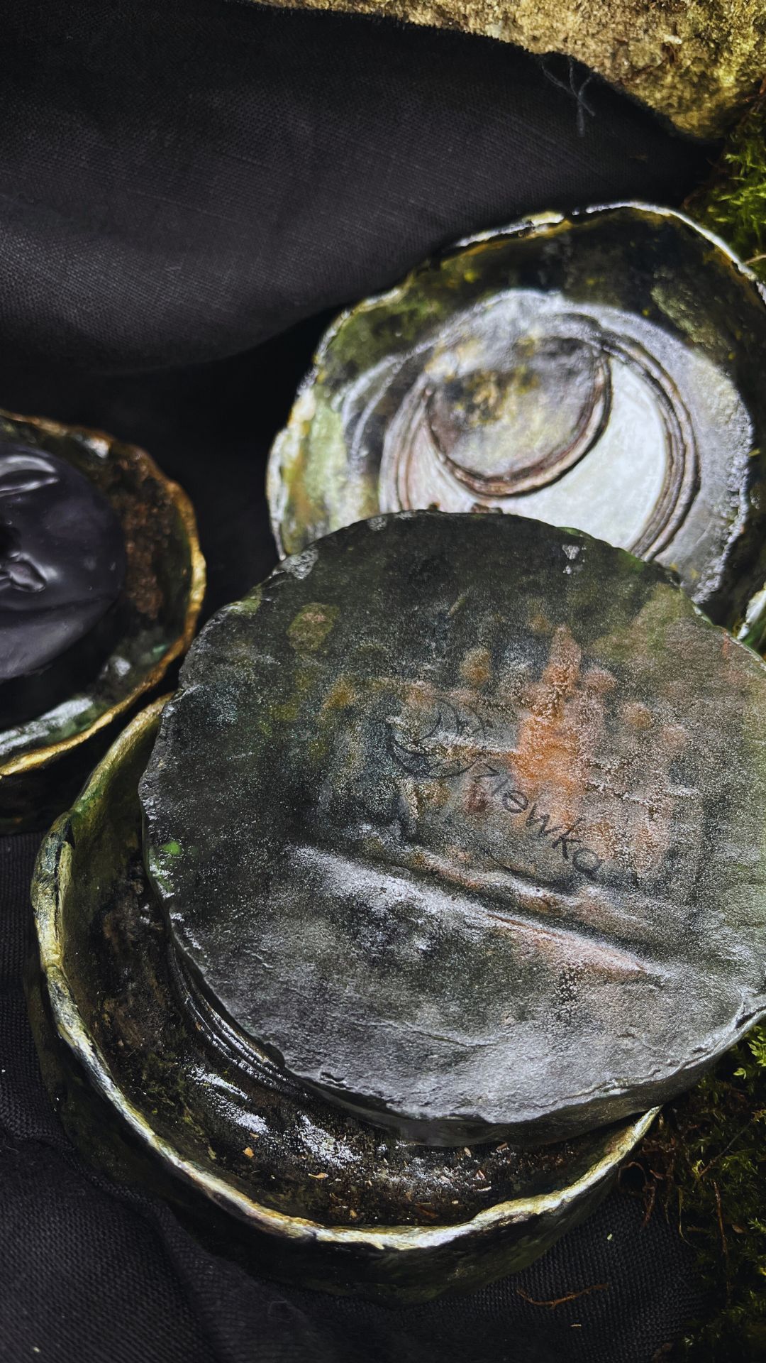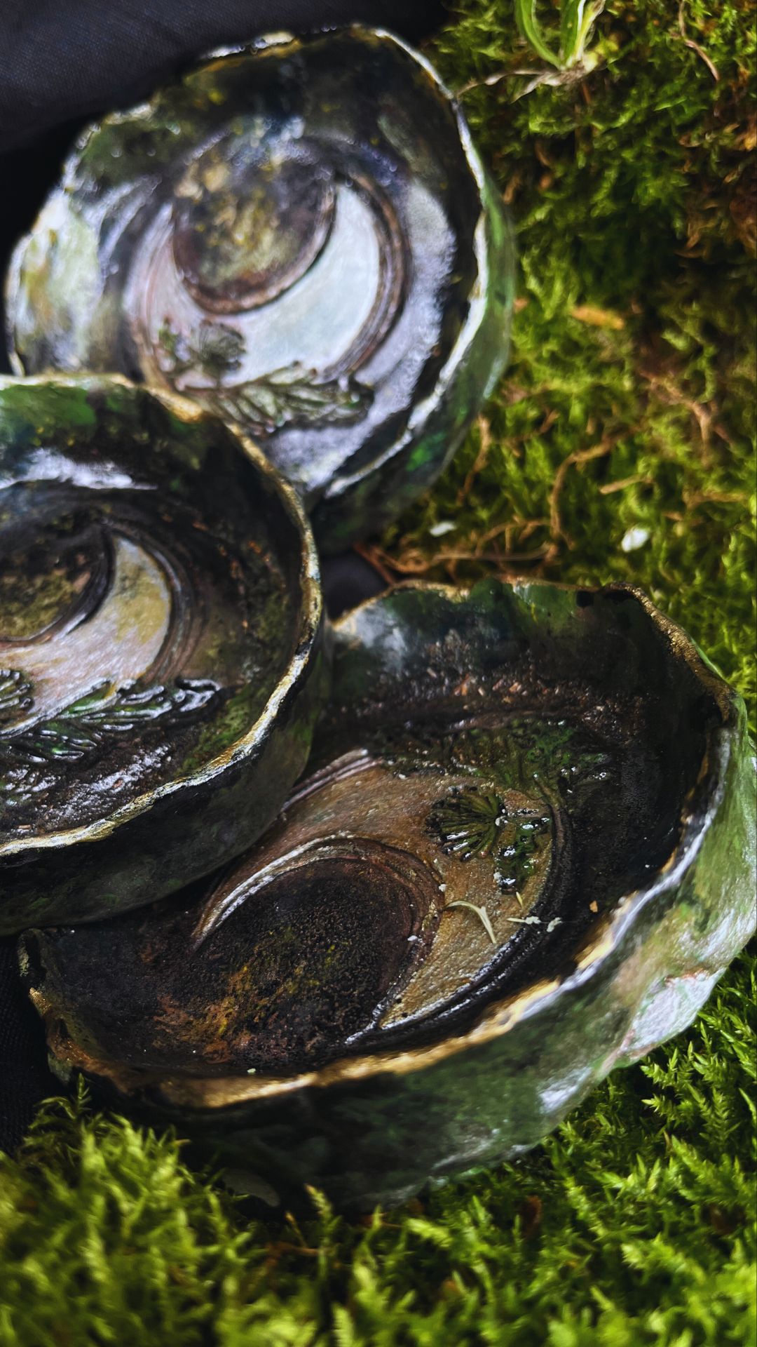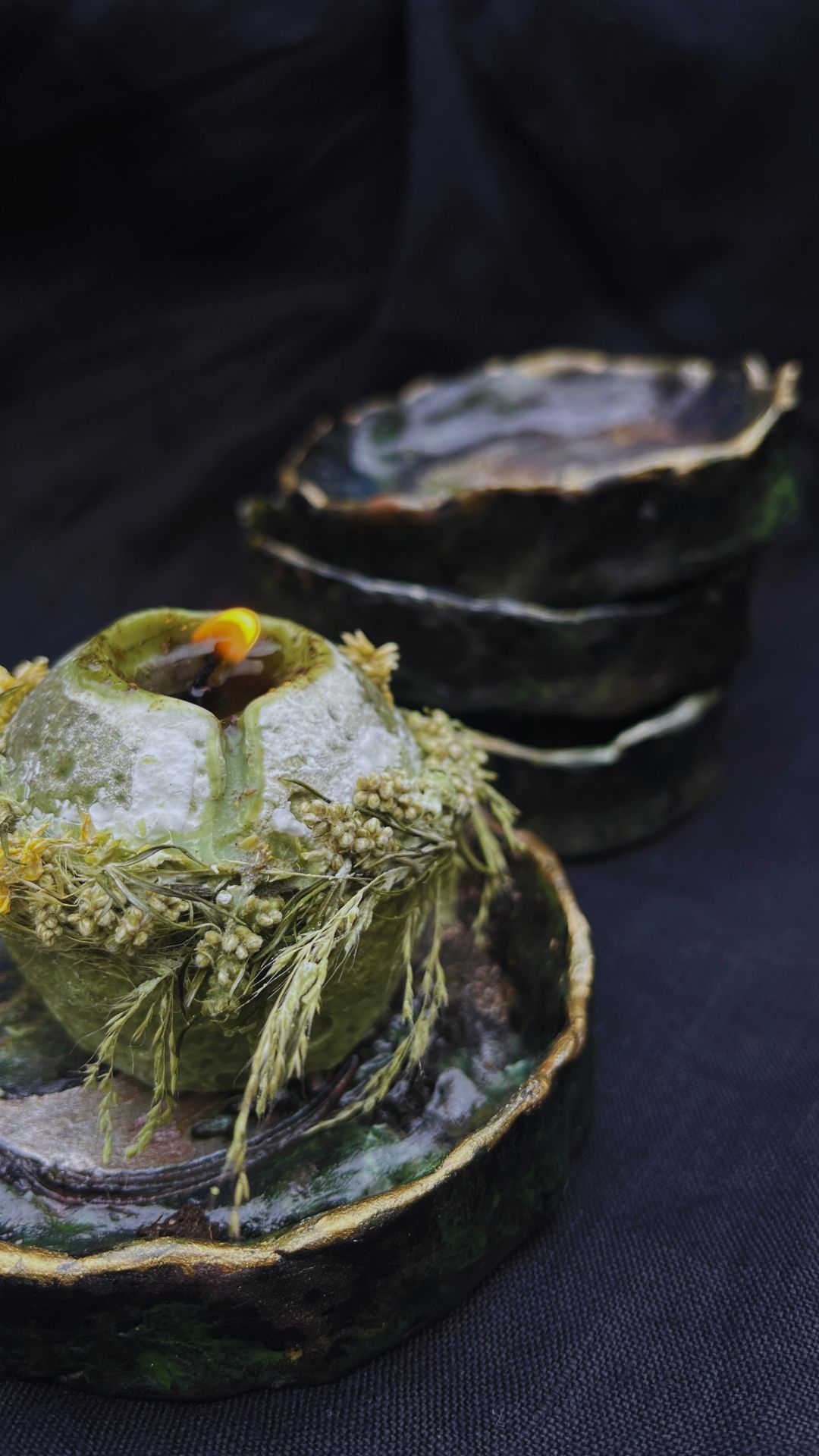 Miseczka została stworzona, by służyć jako bezpieczne miejsce do palenia świec, jednocześnie chroniąc powierzchnie przed rozlanym woskiem. Możesz jej również użyć jako ozdobnej podstawki na biżuterię, zioła lub inne drobiazgi. Subtelne zdobienia, nawiązujące do blasku i tajemnic Księżyca, sprawiają, że miseczka idealnie pasuje do wnętrz inspirowanych naturą i rękodziełem. Kolorystykę tej miseczki dobrałam myślą o głębokim, mszysto zielonym odcieniu, inspirowanym soczystym leśnym runem. Ten kolor symbolizuje połączenie z naturą i przynosi na myśl gęste, tajemnicze lasy, gdzie Księżyc delikatnie oświetla ścieżki.