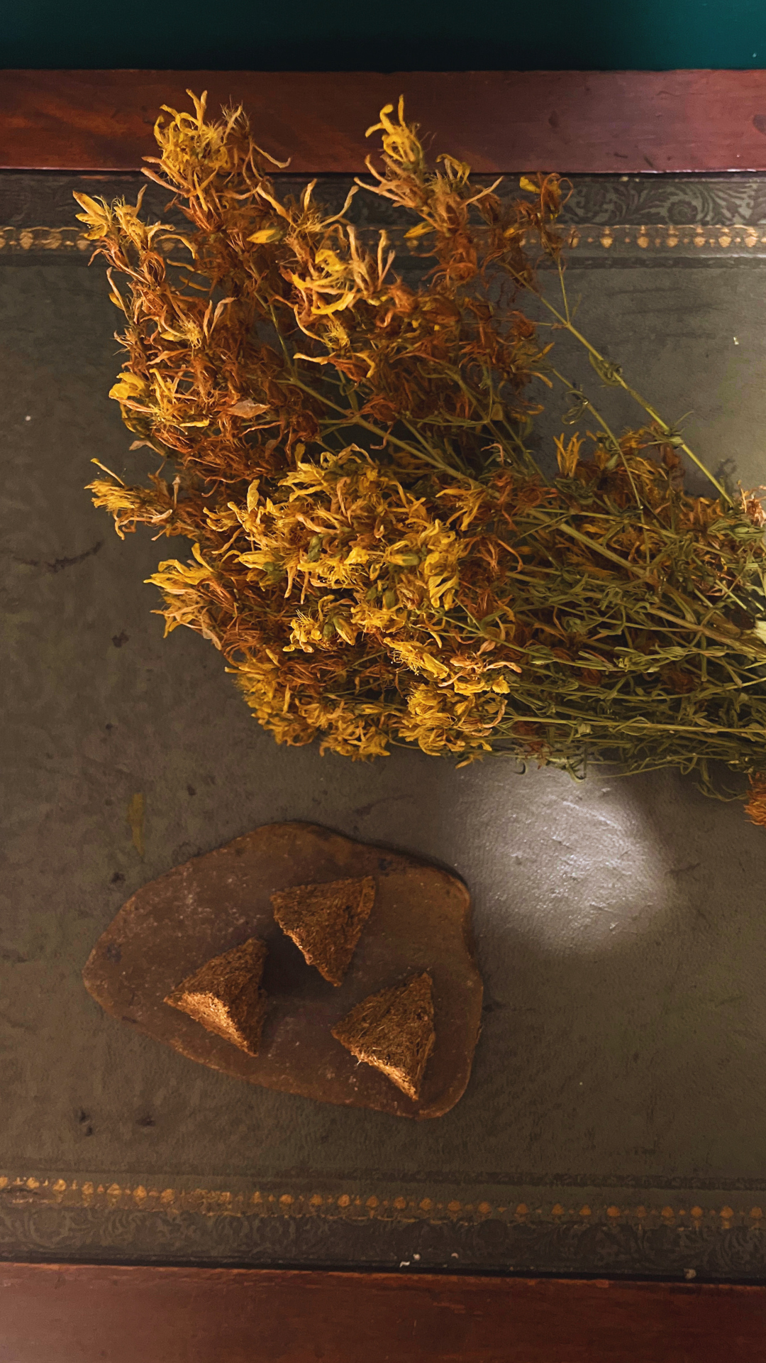 Słoneczny Dotyk… stożkowe kadzidło ze zmielonego dziurawca i kolendry to wyjątkowa mieszanka, która łączy w sobie słoneczną energię i kojący aromat tych niezwykłych roślin, od wieków obecnych w tradycji ludowej i magicznej kulturze Słowian.