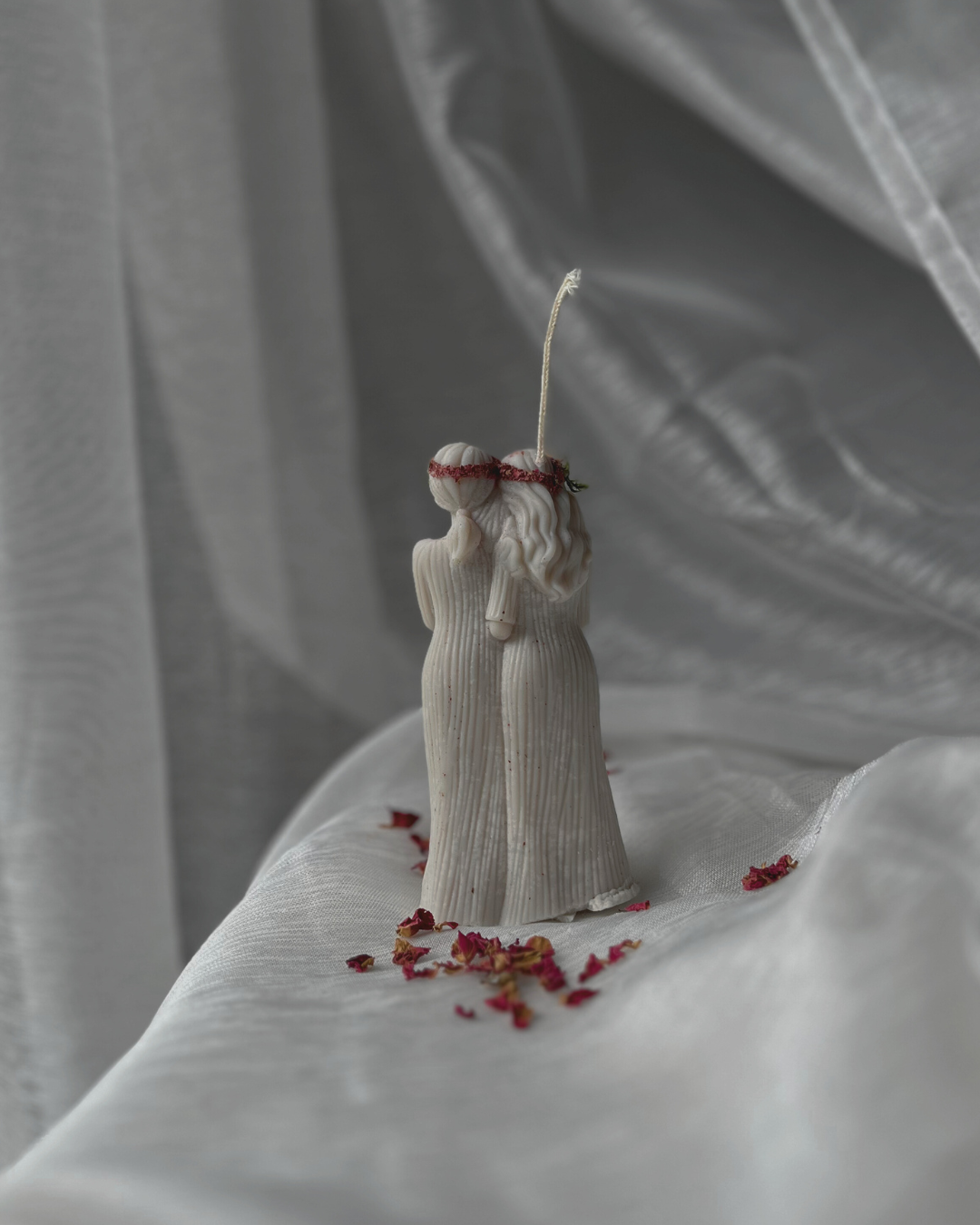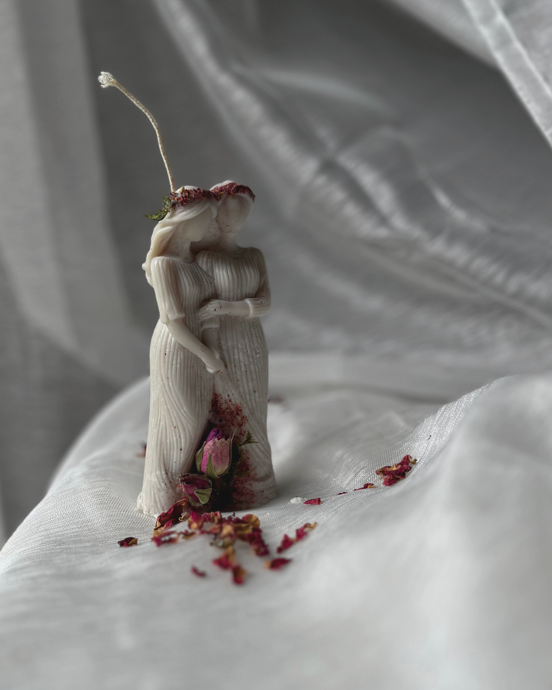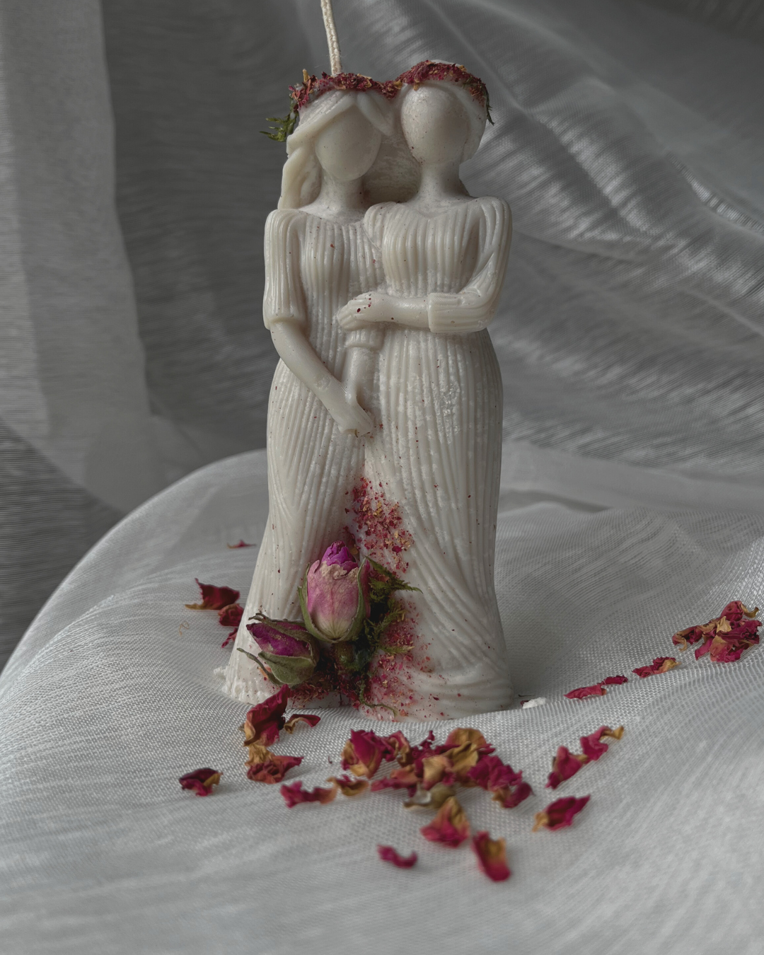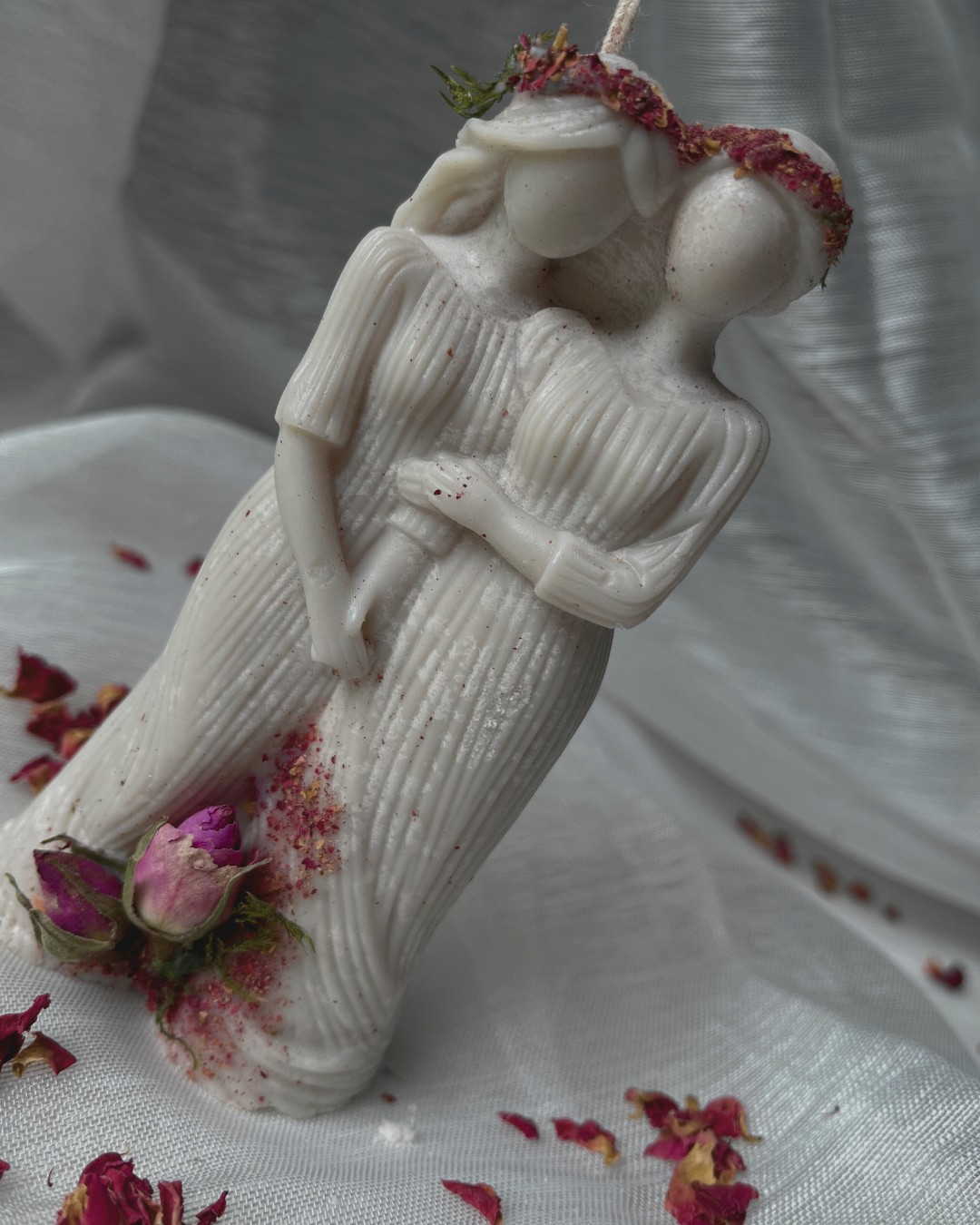 Ta świeca jest właśnie takim rytuałem zamkniętym w wosku. Jej kształt przedstawia dwie splecione kobiece sylwetki – starszą i młodszą, symbolizujące Matkę i Córkę, Mistrzynię i Uczennicę, Przeszłość i Przyszłość. Naturalny mech i suszone płatki róż, którymi świeca jest ozdobiona, podkreślają jej związek z naturą i cyklem życia, a także z Matką Ziemią – tą pierwszą i najstarszą z Matek.