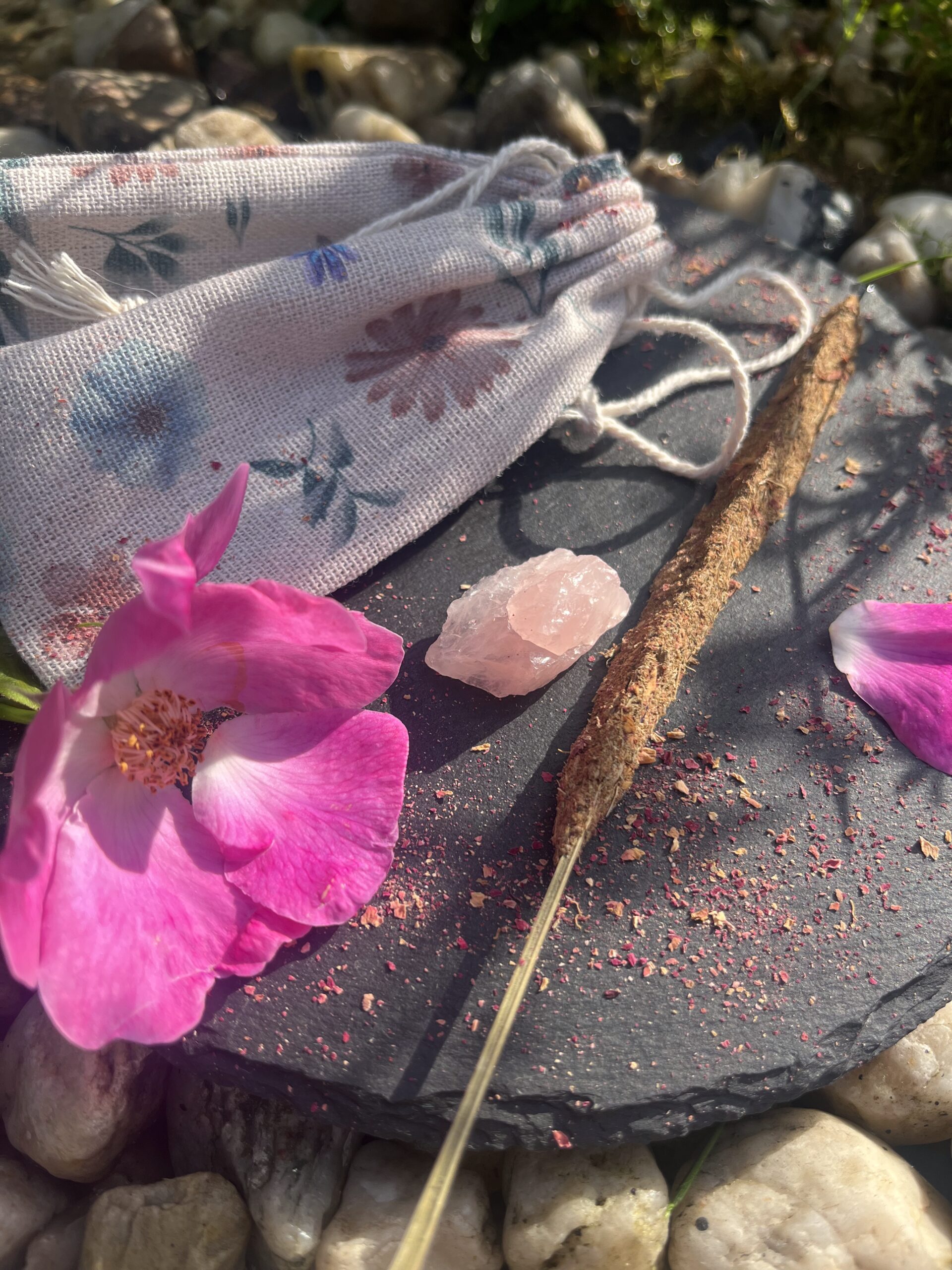 Rytuał Dwojga Dusz – Kadzidło Kwietne Pocałunki + Kwarc różowy + woreczek