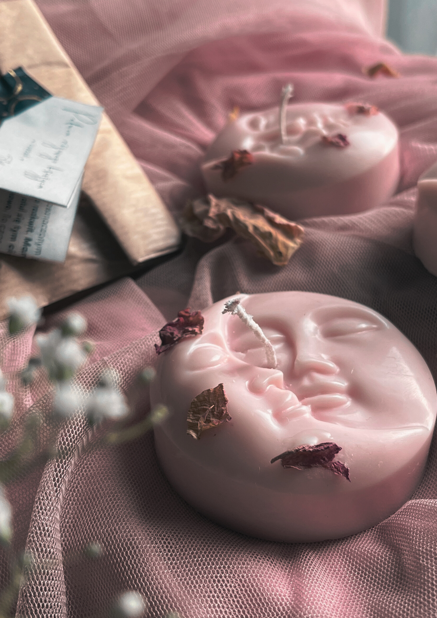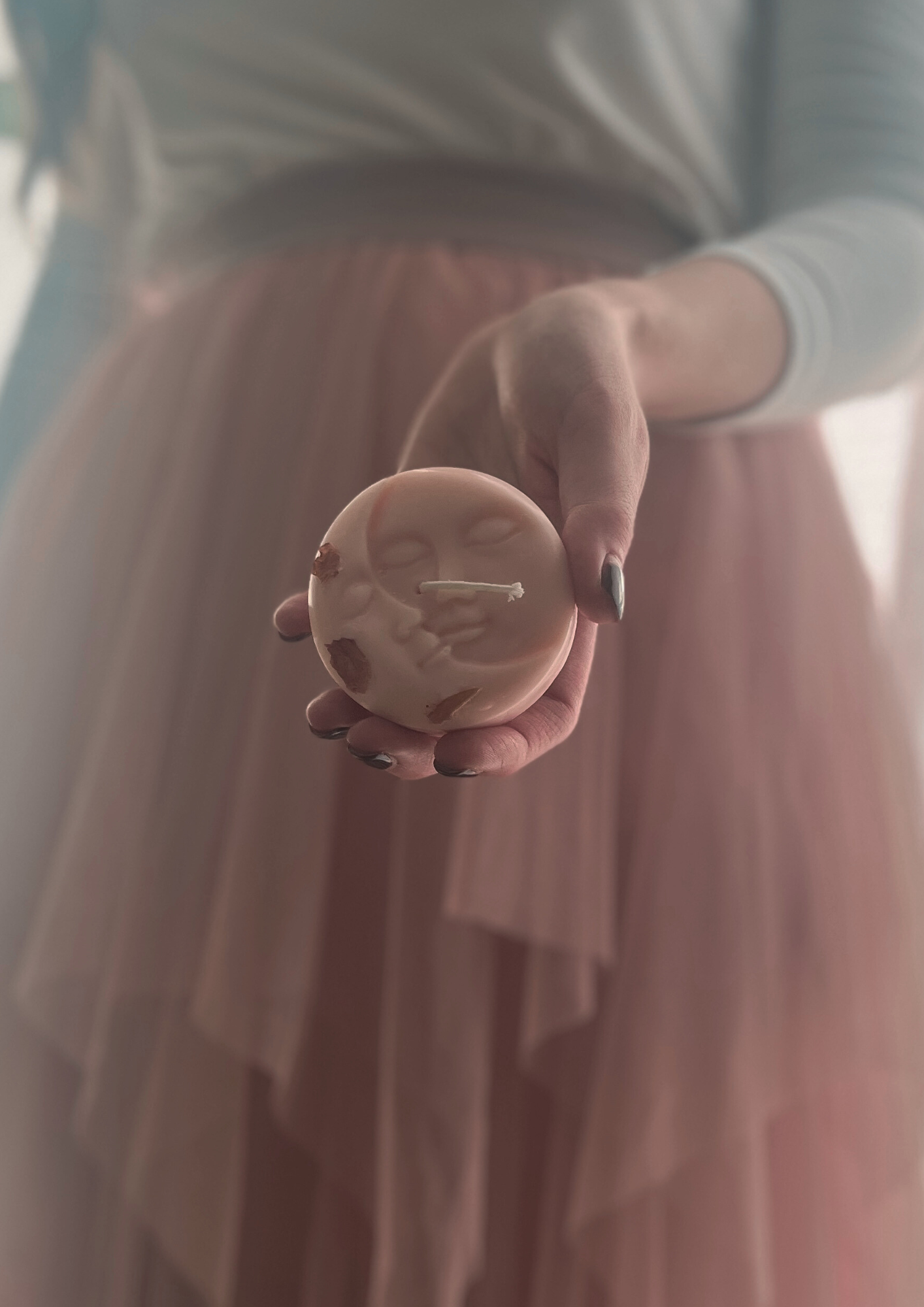 – świeca sojowa w kształcie księżyca o wadze około 60 g i średnicy 6,5 cm