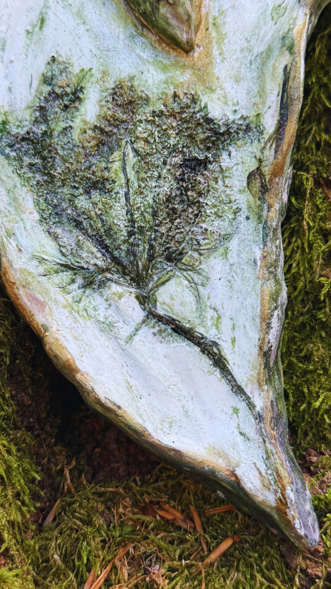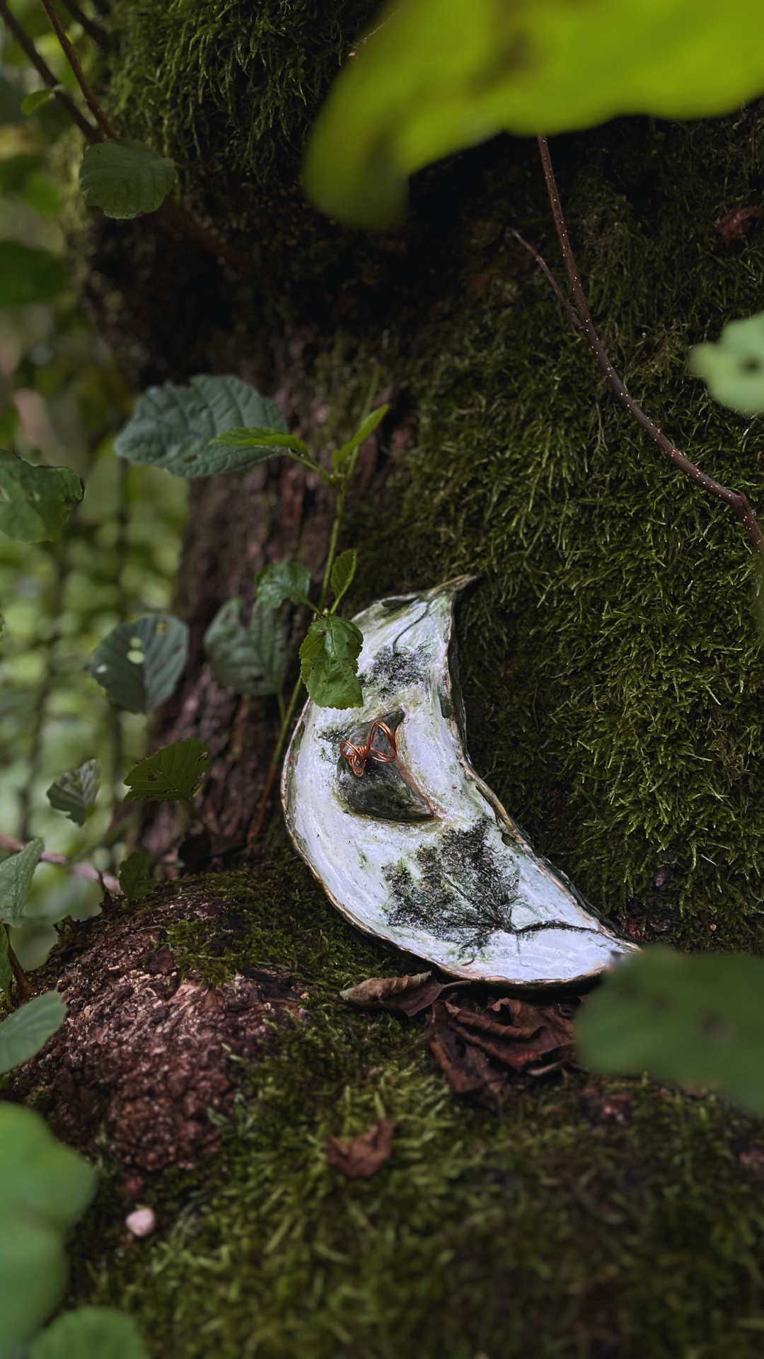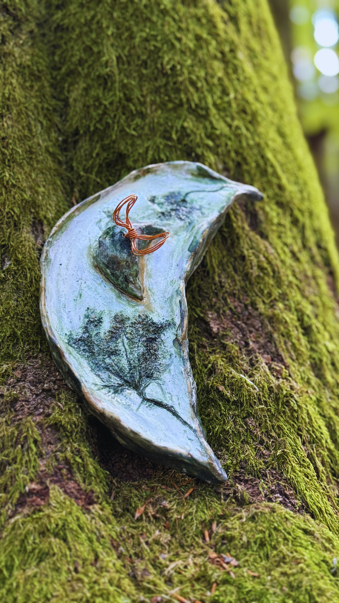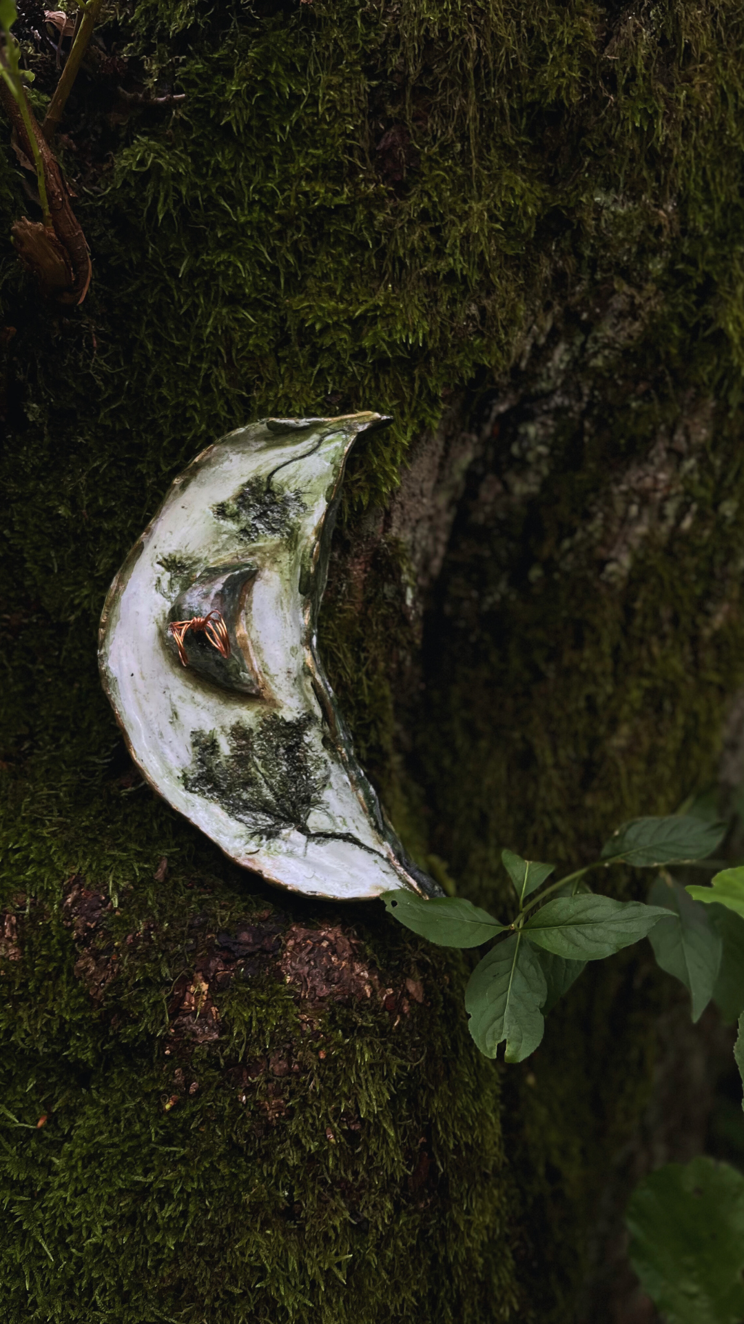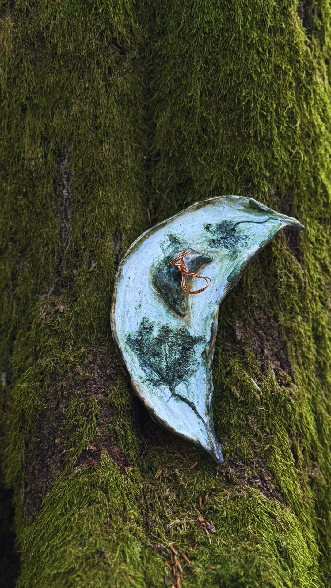 Szepty Lunuli to ręcznie wykonana podstawka pod kadzidło wiązane (różdżki / smużki) w kształcie półksiężyca, inspirowana słowiańskim amuletem lunuli.
