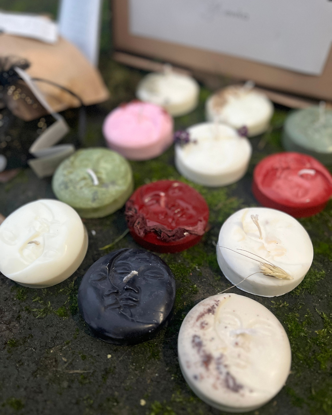- 12 świec księżycowych – każda z nich dedykowana Pełni danego miesiąca, by pomóc Ci wprowadzić odpowiednią energię do Twojego rytuału (każda o wadze około 60 g i średnicy 6,5 cm)