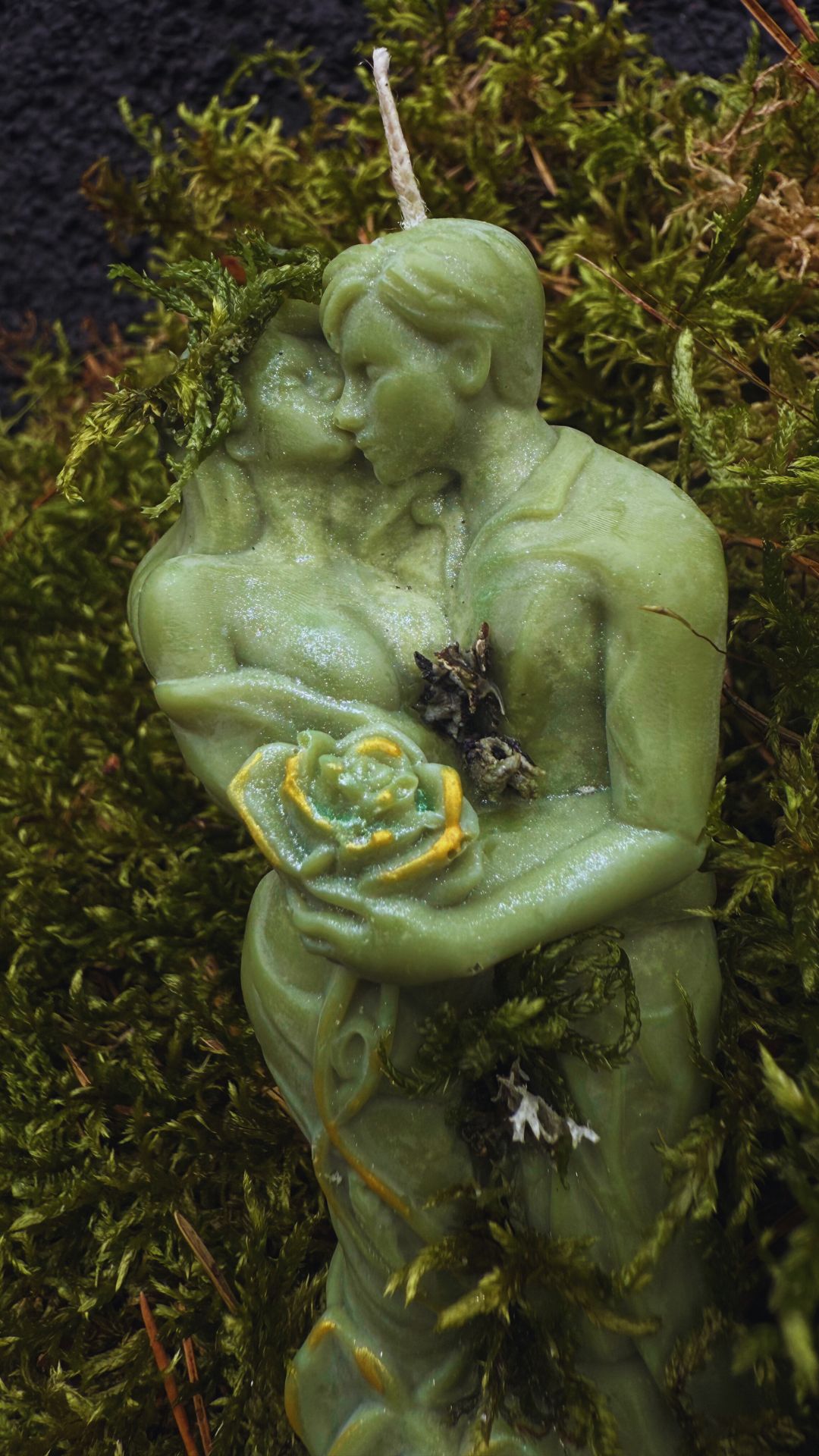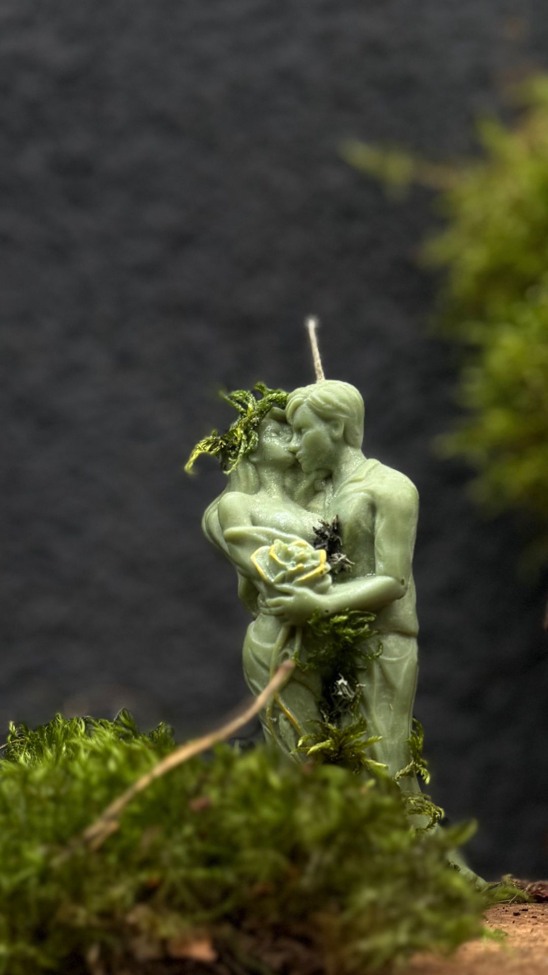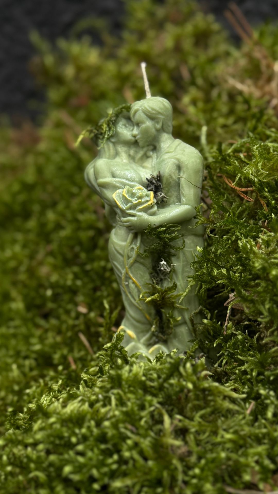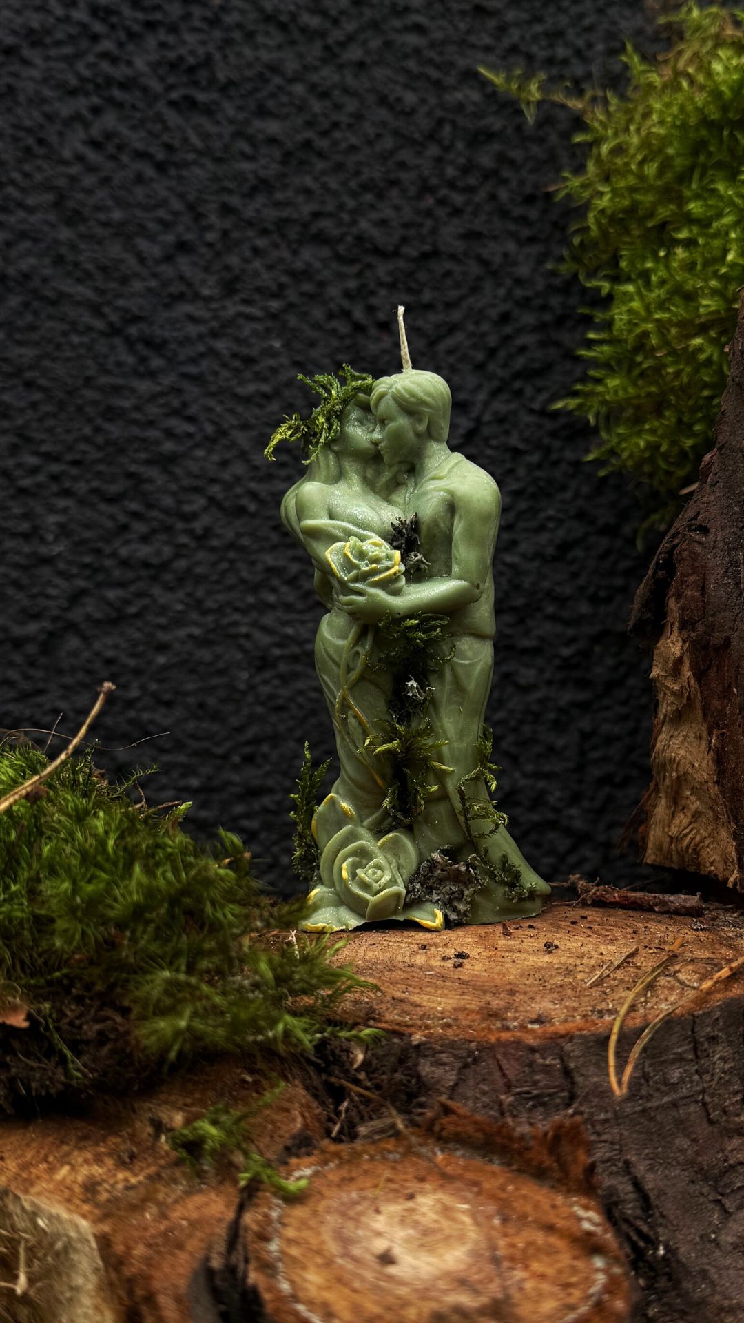 Zielony wosk oraz naturalne roślinne zdobienia nadają świecy miękki, organiczny charakter. Mchy i porosty podkreślają dojrzałość uczucia, a wyrzeźbiony kwiat róży staje się symbolem namiętności i delikatnego dotyku, który nie potrzebuje słów.